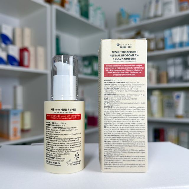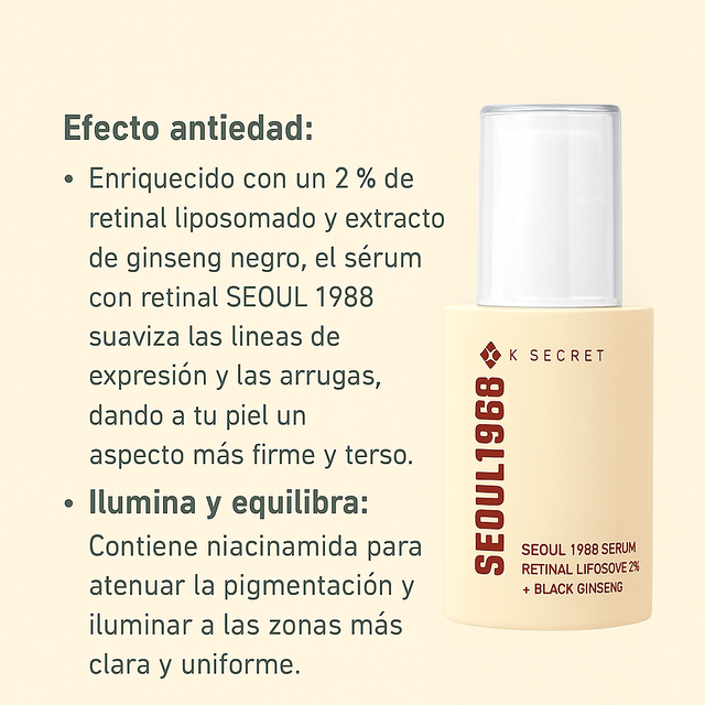 Sérum KSECRET SEOUL 1988 con 2% retinal liposomado + ginseng negro: alisa líneas y arrugas, ilumina y unifica con niacinamida. Piel más firme, tersa y radiante. ✨🌿🧪