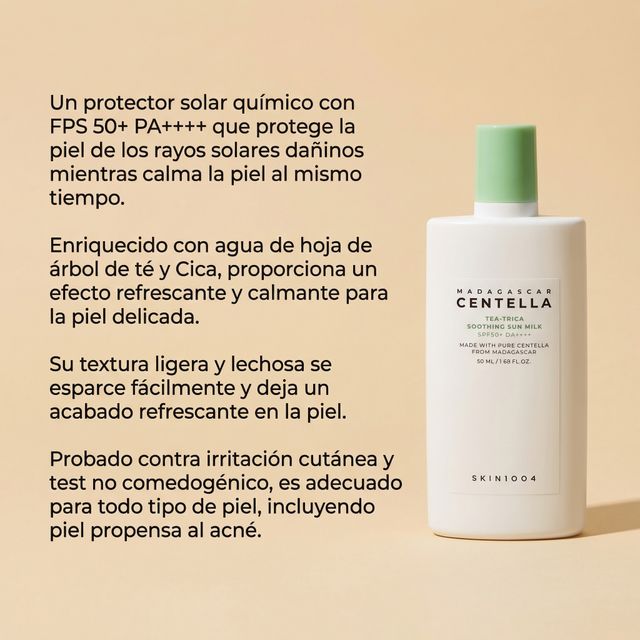 El Milk Solar Calmante Tea-Trica de SKIN1004 es un protector solar especialmente diseñado para pieles sensibles o con tendencia al acné.