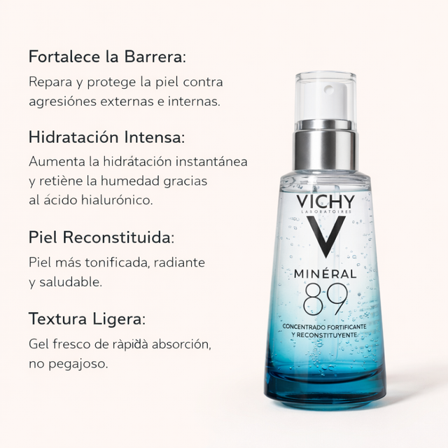 Sérum potenciador diario (booster) que hidrata, rellena y fortalece la barrera cutánea con un 89% de Agua Volcánica de Vichy y ácido hialurónico.