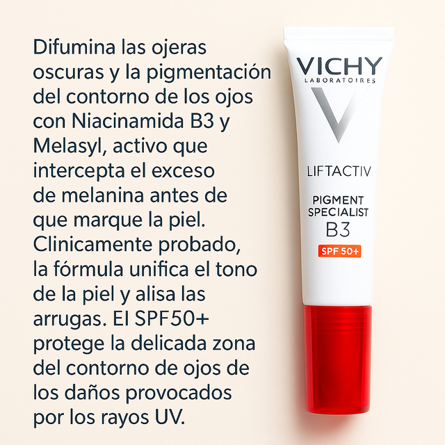 🌞👁️ Corrige ojeras y manchas con Melasyl™ y Niacinamida B3. Ilumina el contorno de ojos y mejora su uniformidad. Ideal para uso diario.