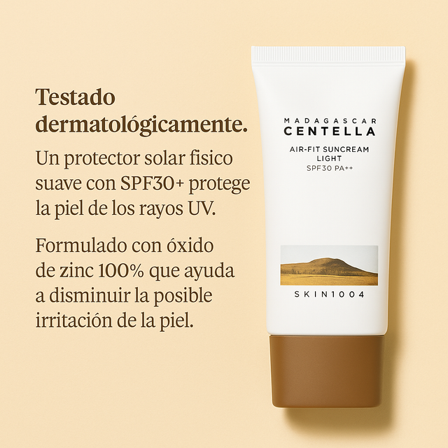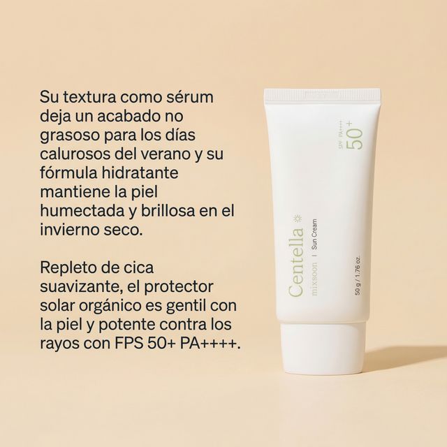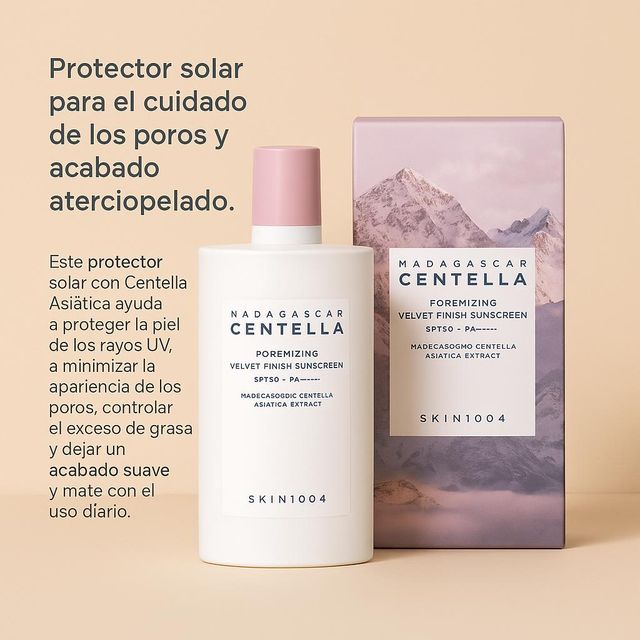 Protector solar SPF50+ con Centella Asiática 🌿 que protege de los rayos UV, minimiza poros y controla el brillo ✨. Ideal para piel mixta, grasa y sensible, con acabado mate y aterciopelado ☀️🧴