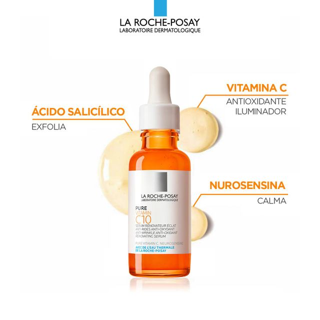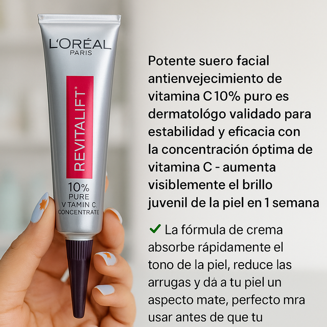 Concentrado facial con 10% de vitamina C pura 🧡 que ilumina visiblemente la piel, mejora su textura y reduce líneas finas y arrugas. Su fórmula sin fragancia es apta para piel sensible.